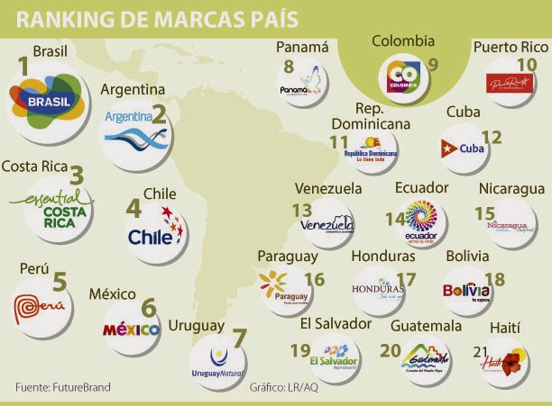 La firma consultora Futurebrand, publicó un ranking de las mejores “Marca País” de Latinoamérica, donde México ocupó el sexto lugar, la lista la encabezan Brasil, Argentina y Costa Rica.