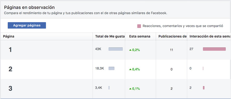 Si accedes a las estadísticas de tu Fanpage en el apartado de información general, si haces scroll verás al final el apartado de “Páginas de Observación”, aquí puedes añadir a tu competencia y fijarte cuál es su evolución semanal, cuántas publicaciones están haciendo y sobre todo, cuántas interacciones tienen.